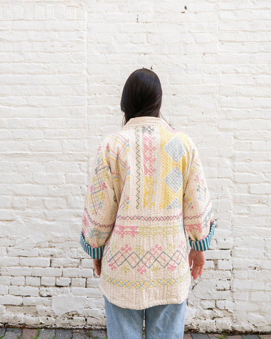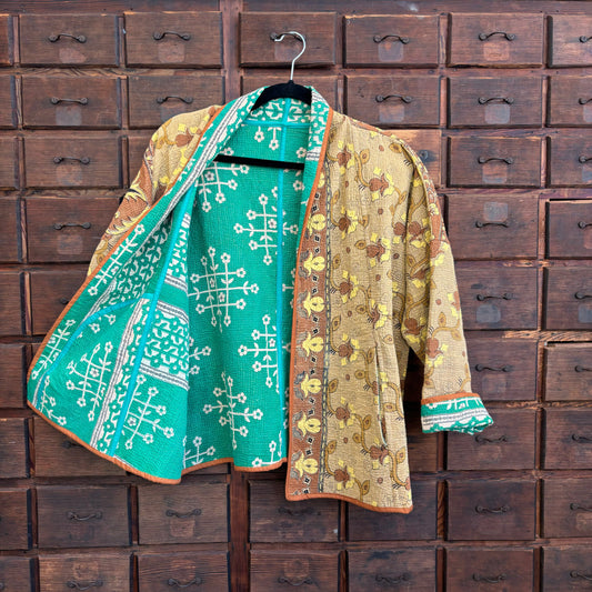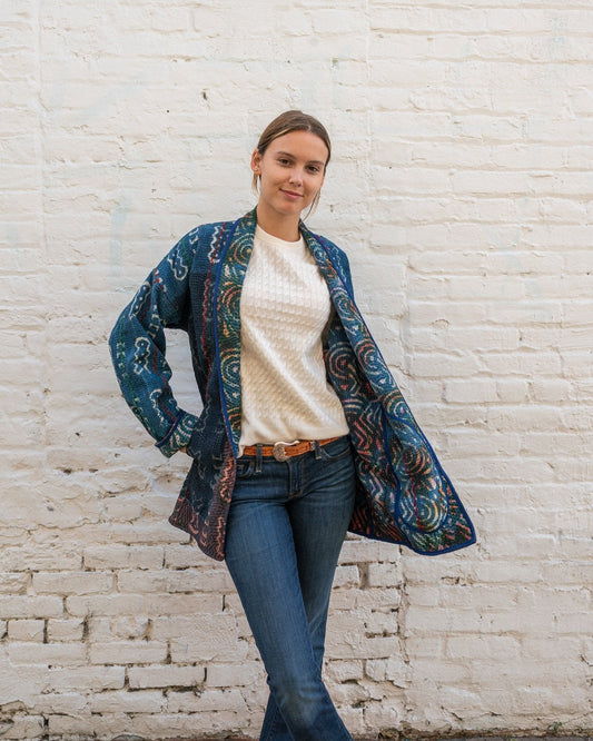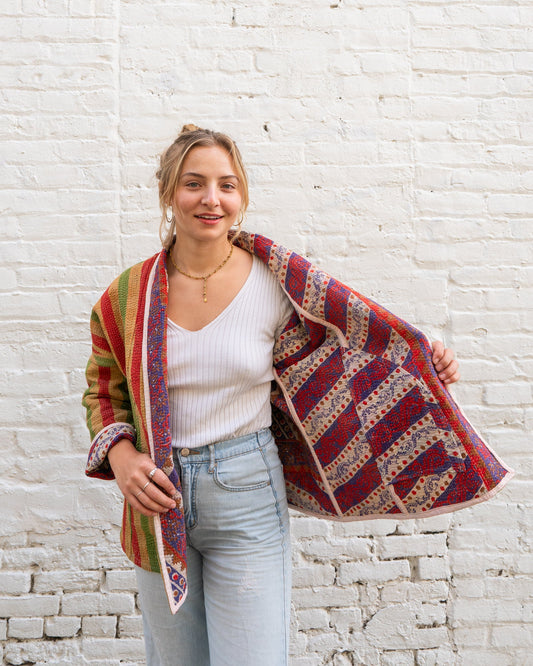 Green/Red Embroidered Indigo Kantha Long Jacket - One Size