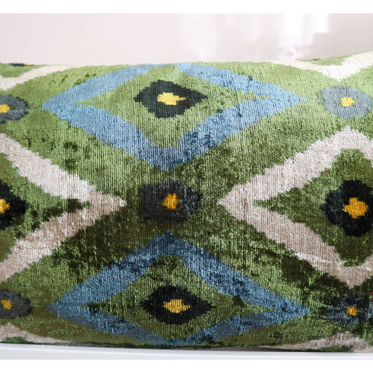 Green, Blue and Yellow Dots Ikat Velvet Silk Pillow
