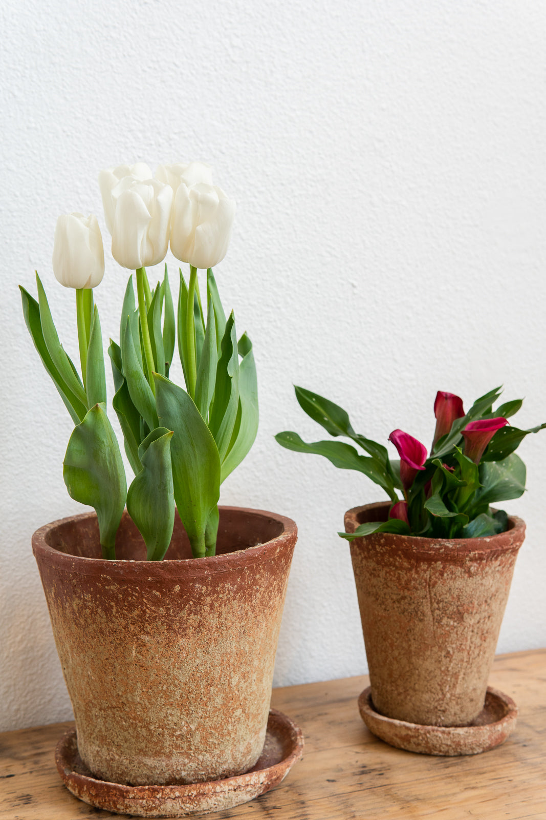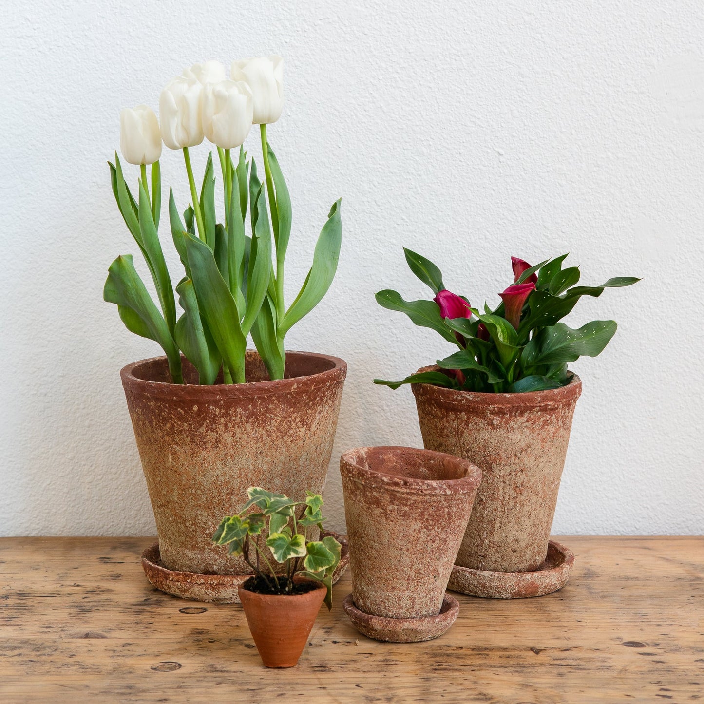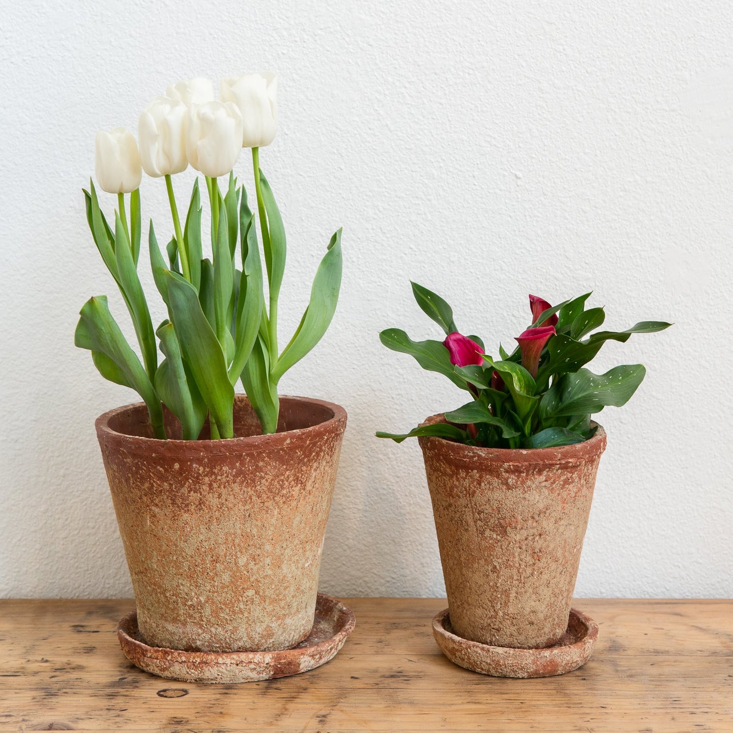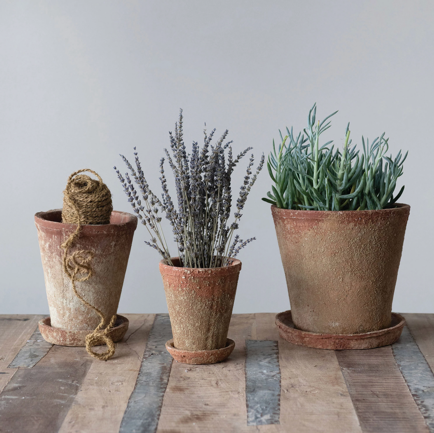 These charming, classic cement planters with saucers have a distressed terra-cotta finish. More chip resistant than clay.