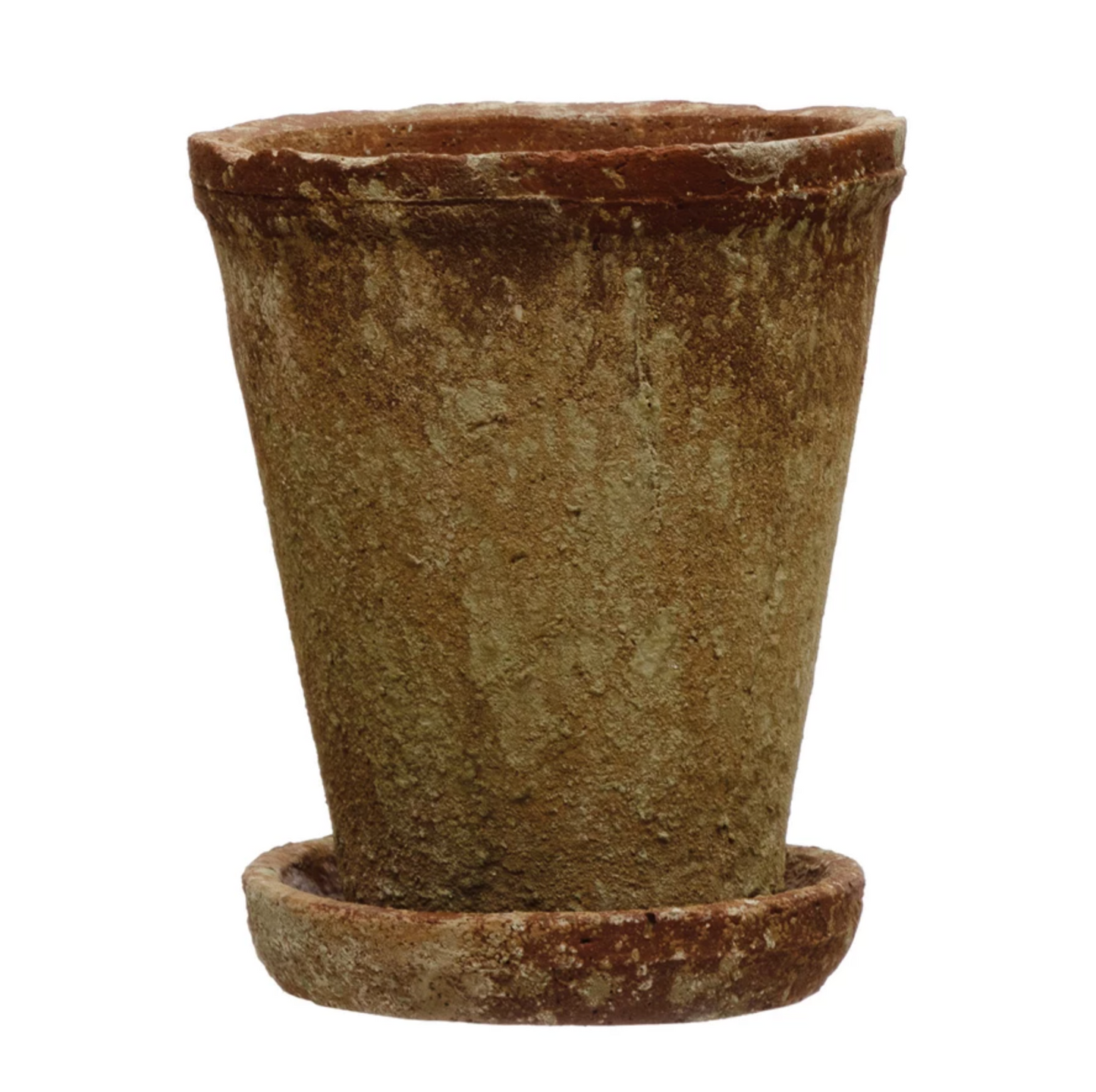 - Cement Planter w/ Saucer, Distressed Terra-cotta Finish