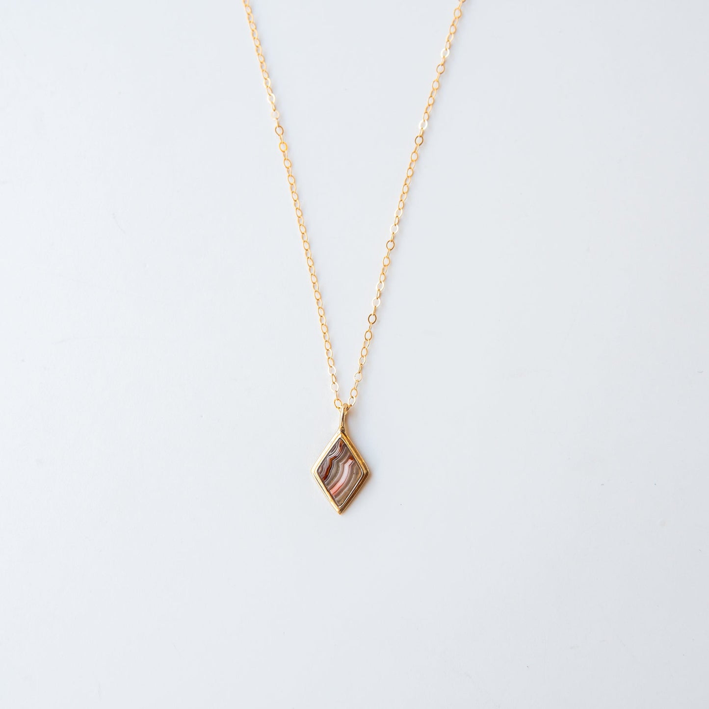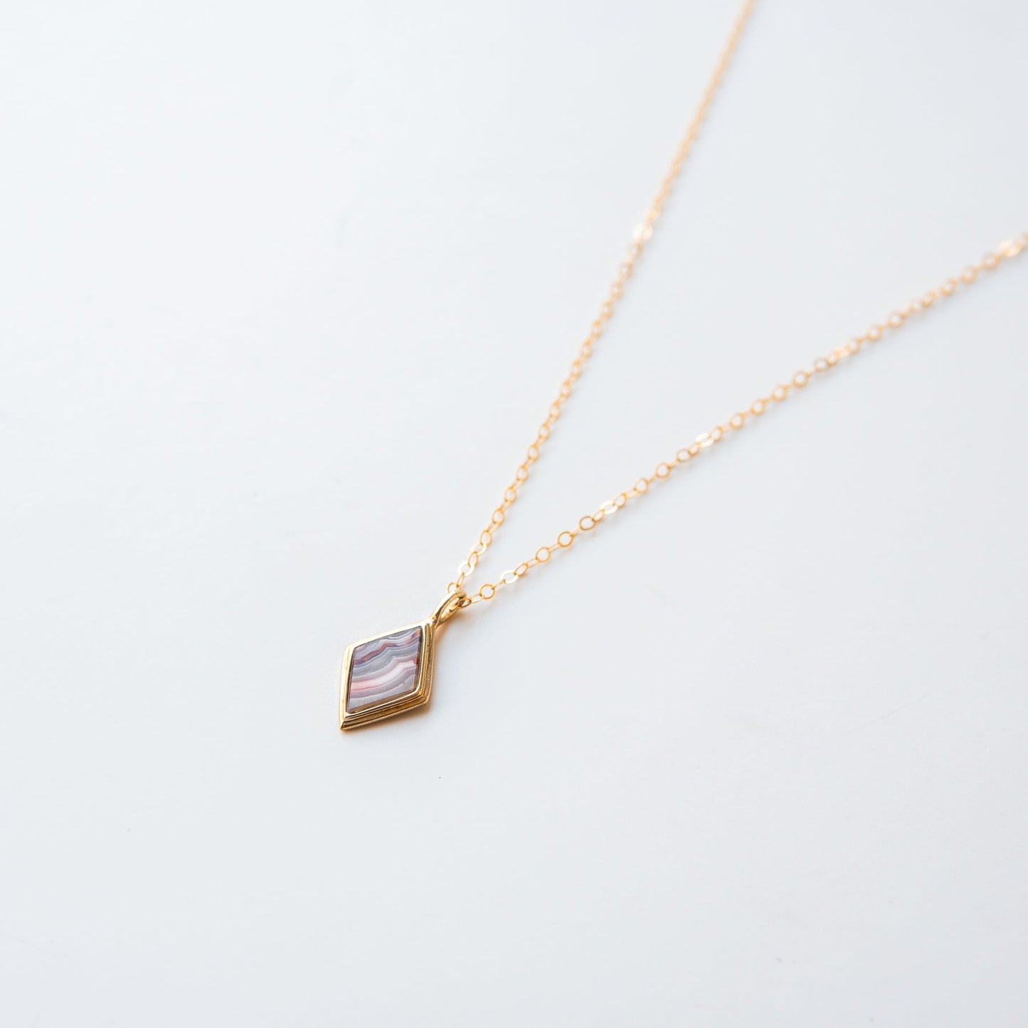This genuine stone pendant necklace is a bit earthy, a bit mystical, a little fierce and incredibly alluring ~ the diamond-shaped hand cut stone is set in a slightly asymmetrical abstract and imperfect metal frame for an organic rustic style that looks as though it could have been found in a treasure chest full of gold and riches at the bottom of the sea.